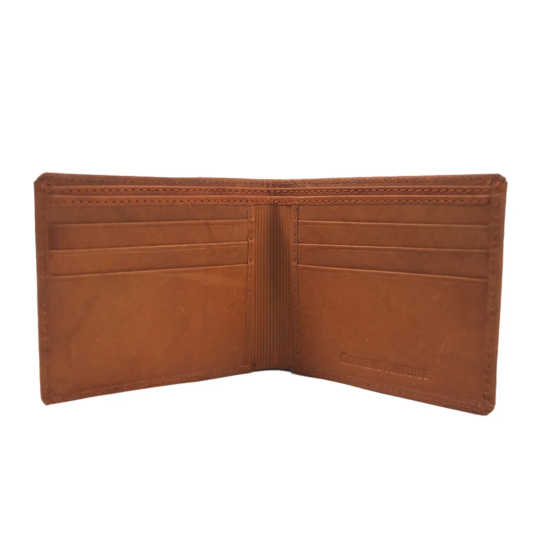A polished brown leather fold-wallet designed for everyday elegance — smooth genuine leather exterior, clean bi-fold layout and smartly organised interior slots for cards, cash and IDs.